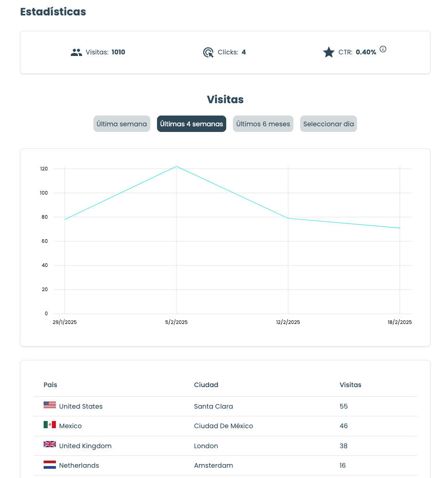 - Lanza y mejora: Comparte en redes, email y otros canales, y analiza métricas como vistas y clics para optimizar.