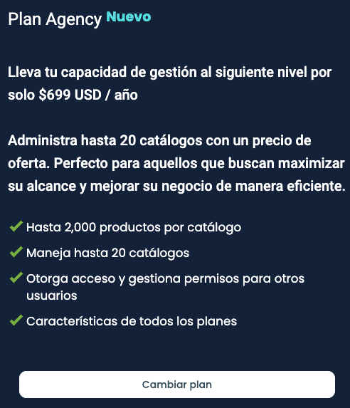 - Costo del Plan Agencia: Este es un pago anual de $699 USD, que incluye 20 catálogos.