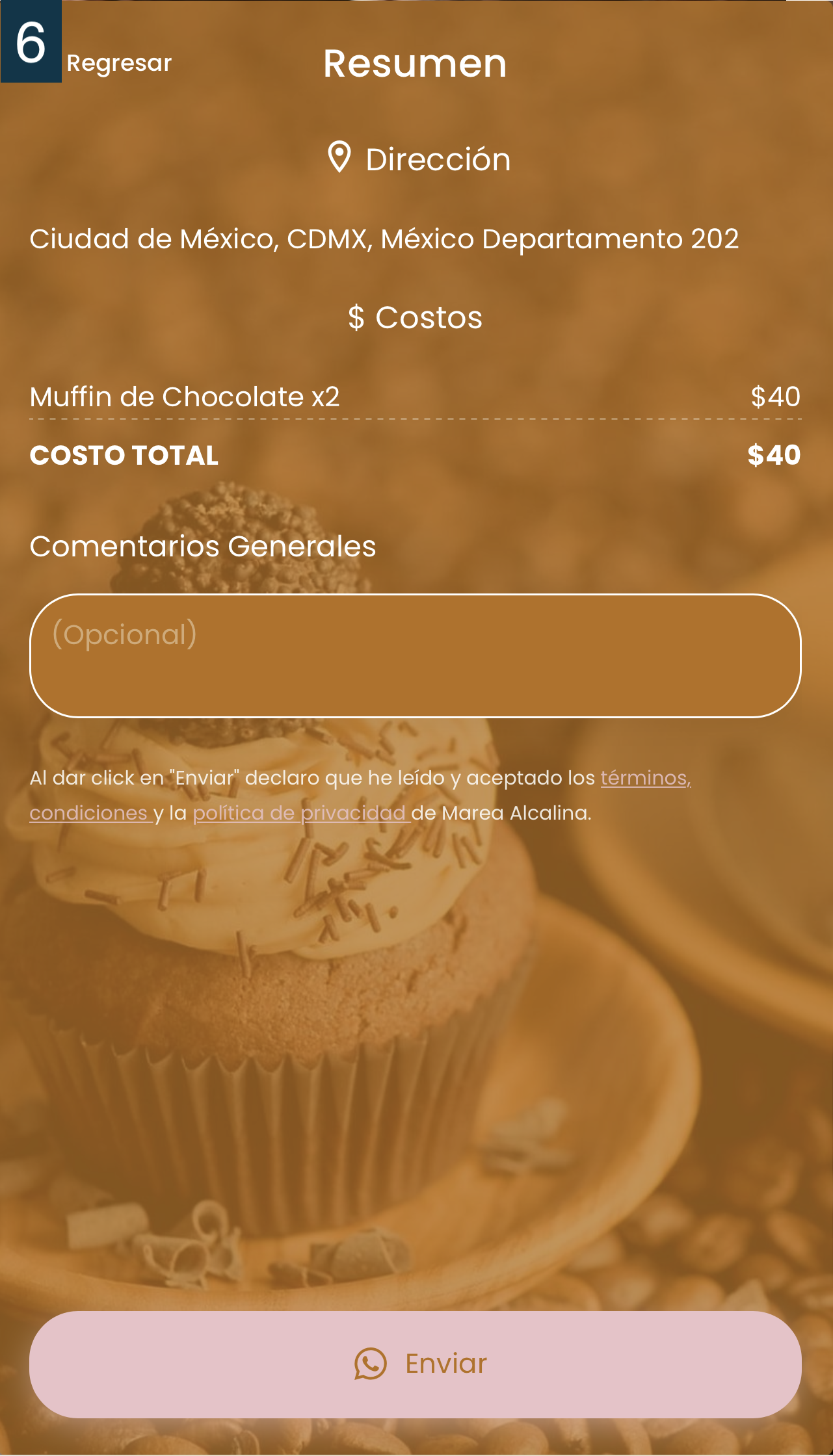 - Por último, se desplegará un resumen del pedido con los detalles, un recuadro más de comentarios generales y el botón que creará el pedido.