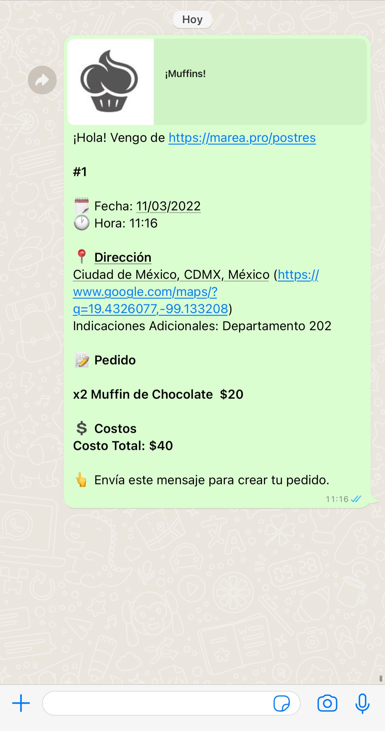 Cuando un cliente da clic en "Enviar" terminando un pedido, se generará automáticamente un mensaje con todos los detalles que necesitamos para atenderlo.