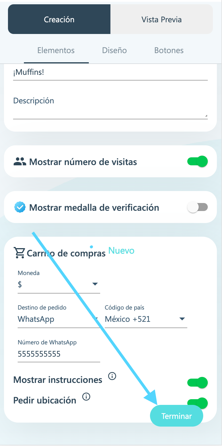 Acabando esto, podemos darle un toque a nuestra página en la sección de "Diseño" eligiendo colores y un fondo para después dar clic en el botón de "Terminar".