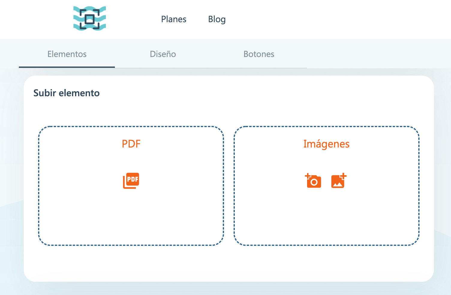 Primero debemos crear nuestra cuenta dentro de la plataforma (si no tienes una, puedes hacerlo gratis aquí). Ya que ingresamos, creamos una nueva página desde cero, y en la sección de "Elementos" bajamos hasta encontrar Subir Elemento, aquí podremos agregar las imágenes de nuestros productos/servicios (puedes agregar uno por uno o arrastrar varias imágenes a la vez).
