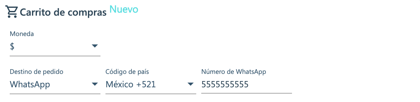 Subimos en esta misma sección para encontrarnos con la configuración de carrito. Aquí seleccionamos nuestro tipo de moneda, WhatsApp como destino de pedido, código de país y escribimos el número de WhatsApp a donde queremos que lleguen nuestros pedidos.